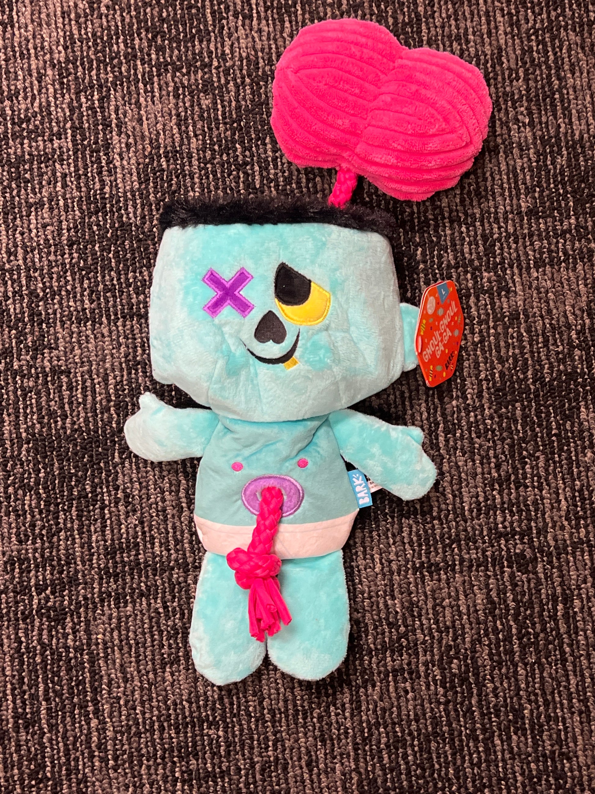 The Bark Ghoul-Ghoul Ga-Ga Halloween dog toy in size Large is perfect for zombie-loving pups 50lbs+! This terrifyingly tough toy is great for tug-of-war and features crazy crinkle, disc squeakers, and a pull-through tshirt rope. Plus, its durable multi-texture fabric means less body fluff for a cleaner playtime!